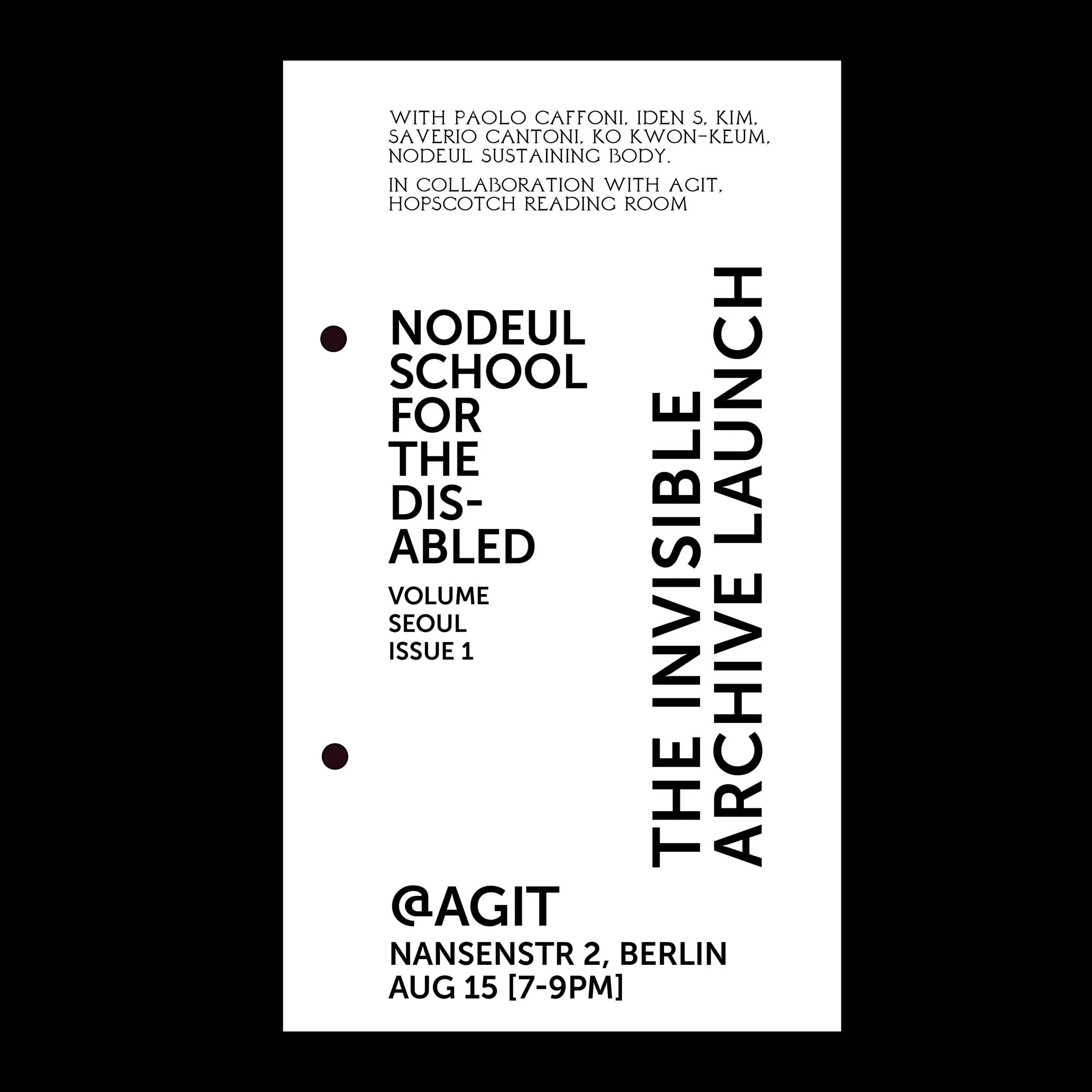 The Nodeul School for the Disabled is a grassroots, self-organized school and activist organization for and by disabled adults located in Seoul, South-Korea. The issue presents Paolo Caffoni's encounter with the school, which practices a pedagogy that empowers students to act politically and to forge resistance and rights for individuals marked by precarity. Issues of disability are discussed through various lenses such as the history of labor and the inherent weaknesses within systems of language and translation.